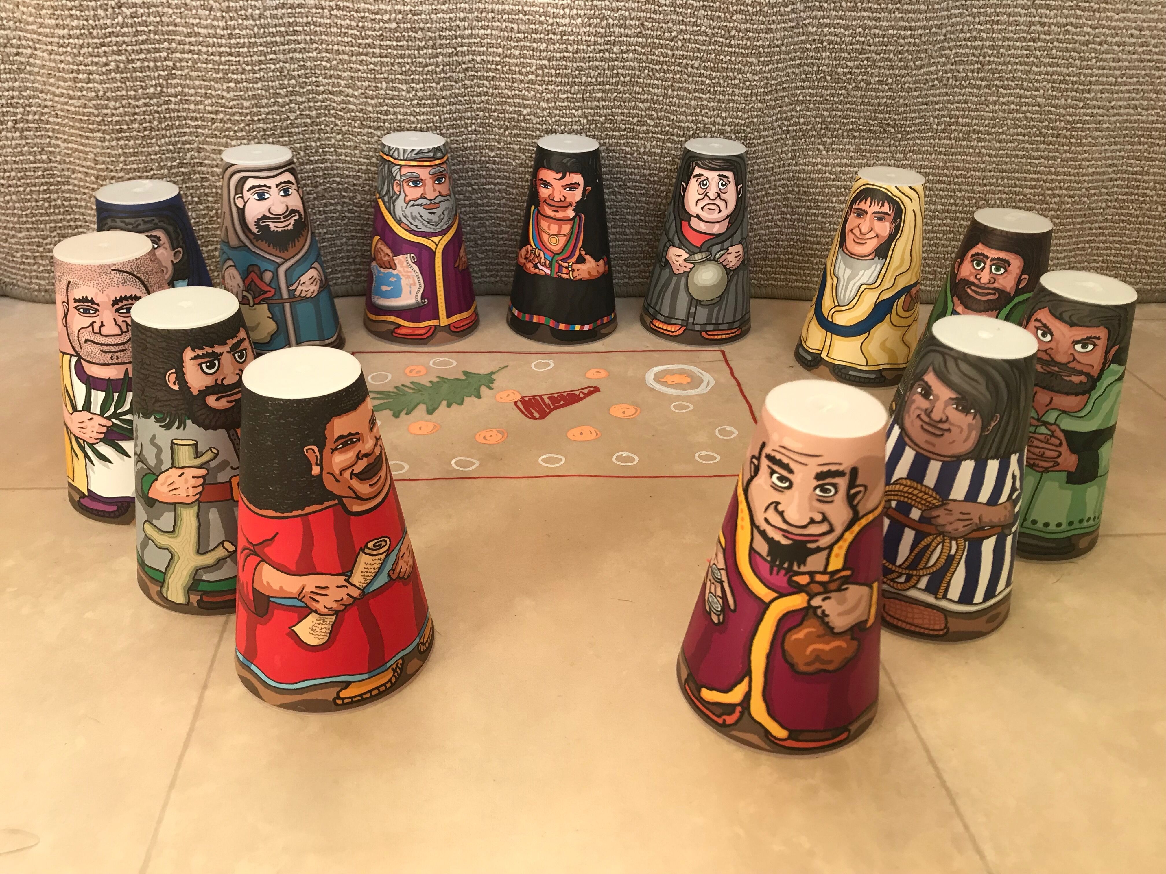 The children can choose 13 Storystack characters to represent Jesus and the 12 apostles (all men who are named in the bible). I drew a table with the passover meal on it using chalk pens that can be washed off.